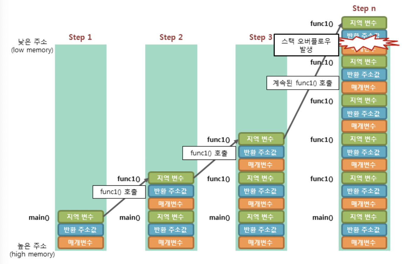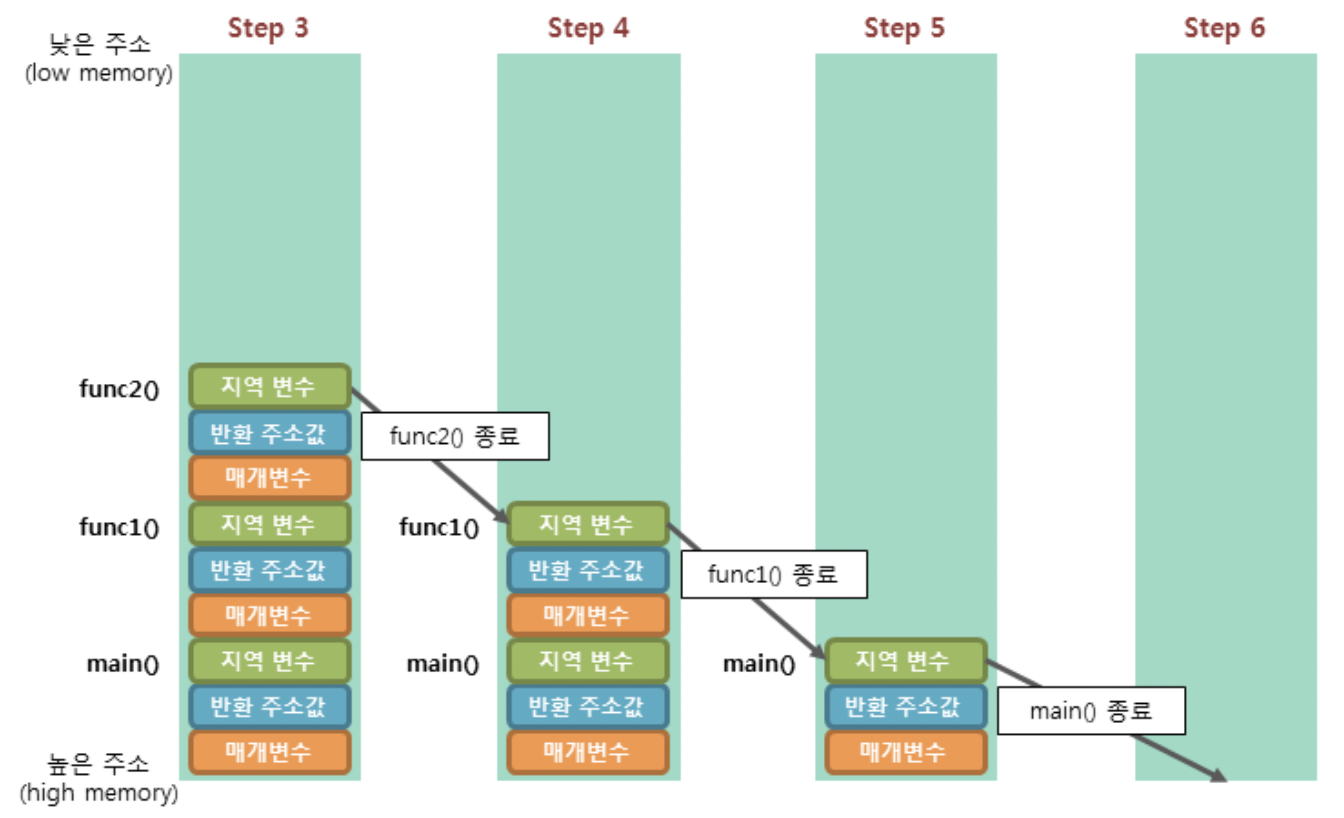 함수가 호출되면, 스택에는 매개변수, 호출이 끝난 뒤 돌아갈 반환 주소값, 함수에서 선언된 지역 변수 등이 저장됩니다.