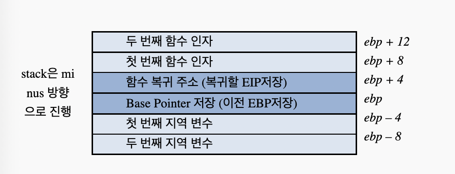 -> sfp가 필요한 이유는, ebp 레지스터는 한 개이기 때문에 함수가 시작할때마다 ebp 값이 바뀌는데 그 전의 ebp 값을 스택에다가 저장해야하기 때문이다.
