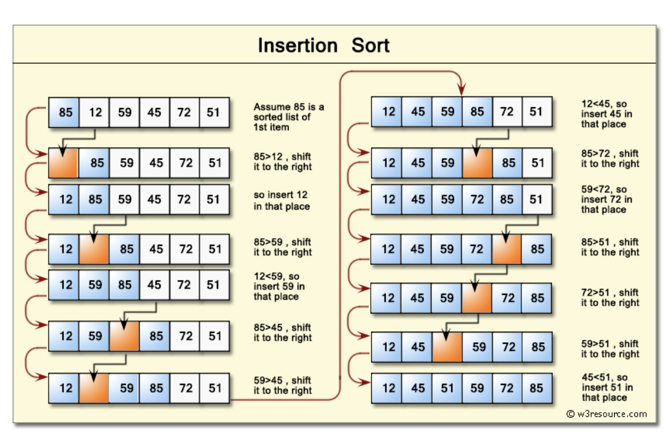 자료 배열의 모든 요스를 앞에서부터 차례대로 이미 정렬된 배열 부분과 비교하여, 자신의 위치에 삽입하는 정렬이다.
