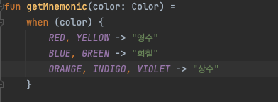 분기 조건에 상수(enum 상수나 숫자 리터럴)만 사용할 수 있는 자바 switch와 달리 코틀린 when의 분기 조건은 임의의 객체를 허용한다.