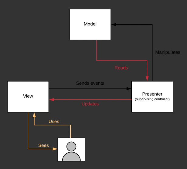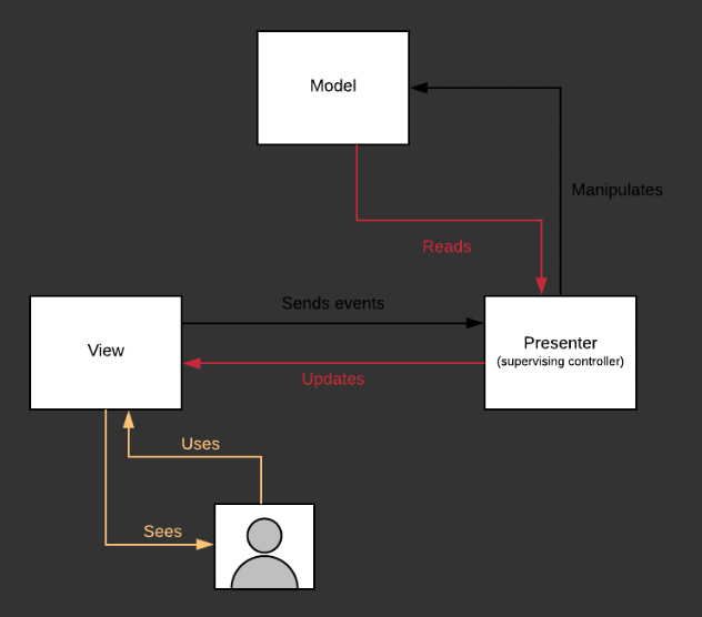 - Presenter 는 View 와 Model 의 인스턴스를 가지고 있어 둘을 연결하는 역할을 한다.