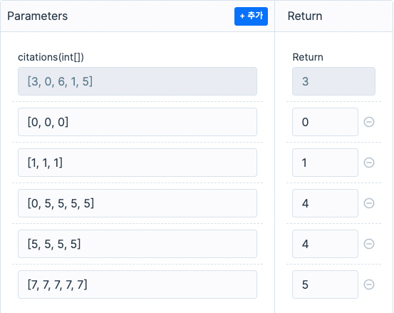 어떤 과학자가 발표한 논문 n편 중, h번 이상 인용된 논문이 h편 이상이고 나머지 논문이 h번 이하 인용되었다면 h의 최댓값이 이 과학자의 H-Index입니다.