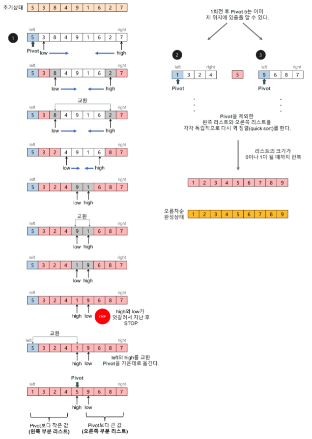 - 피벗을 중심으로 오른쪽 : 피벗보다 큰 요소들