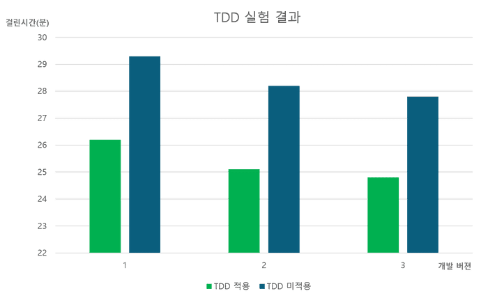 위 그래프를 보면, TDD 를 적용한 개발이 생산성이 더 좋다는 결과로 나왔다.