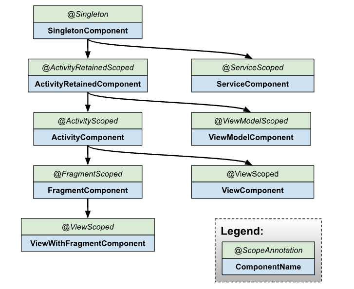 Hilt 는 안드로이드 애플리케이션의 다양한 생명주기에 자동으로 통합되는 내장 컴포넌트 세트를 해당 스코프 애노테이션과 함께 제공한다.