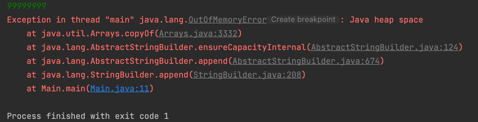 최대 값은 1억이라는 수입니다. 분명 1억이라는 수를 계속 스트링빌더에 담아주면 담긴 공간이 초과하게 될것입니다.....