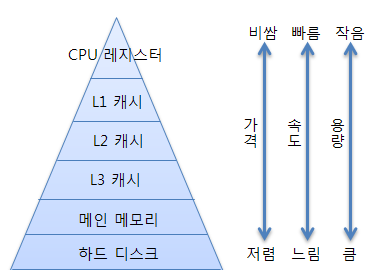 보통 L1, L2, L3 캐시로 나뉘어지는데, CPU에 가까운 캐시일수록 작고 비싸고 빠릅니다.