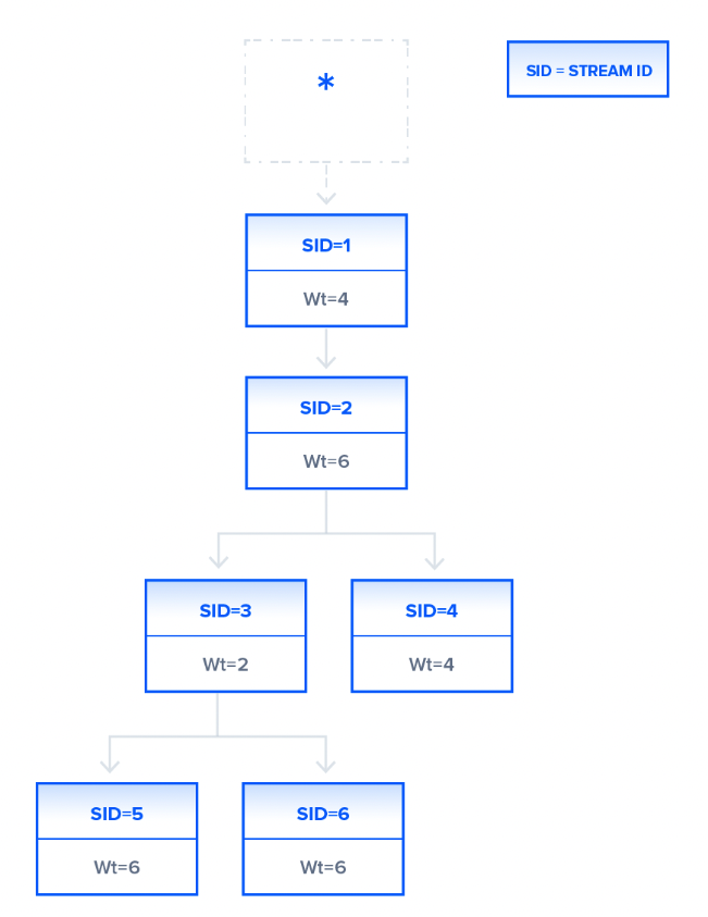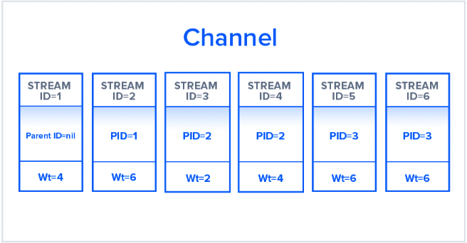 이외에도 클라이언트는 각 스트림의 종속성을 ID로 지정하여, 명시합니다.