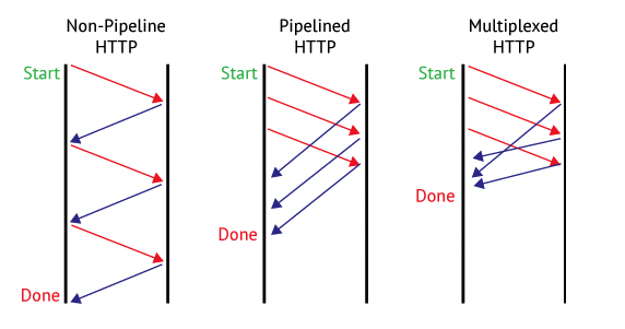압축, 멀티플렉싱, 우선순위 지정 등의 기술을 사용하여, 웹 페이지 로드 레이턴시를 줄이려는 목적으로 구글에서 개발한 SPDY 프로토콜로 시작된 기술입니다.
