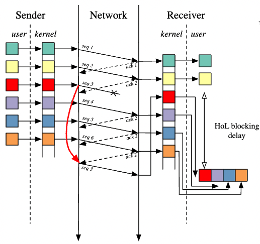 동일한 대상으로 이동할 때, 여러 데이터 패킷이 동시에 통과할 수 없기 때문에, 대기열 앞에 있는 요청이 이후의 모든 요청이 차단되어 버리게 됩니다. 이를 HOL(Head of line) 블로킹으로 알려져 있습니다.