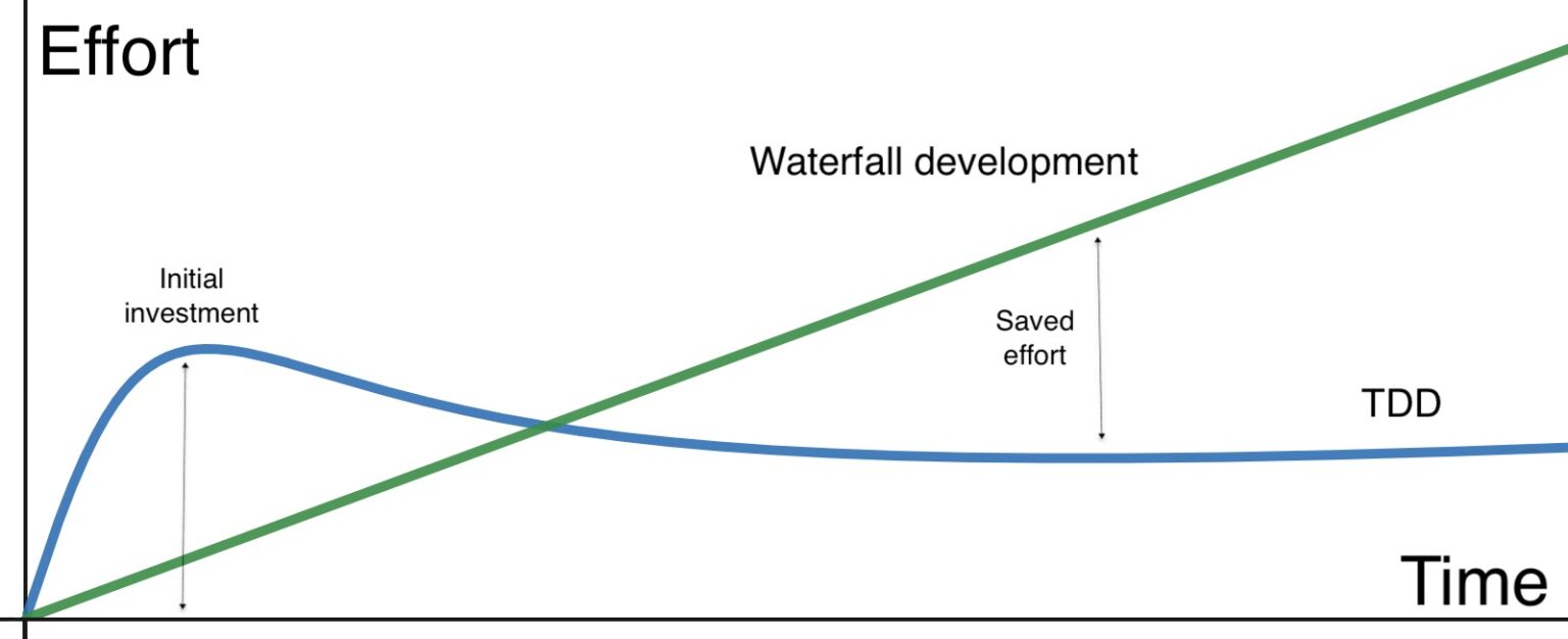 왜냐하면, TDD를 사용할 때 초기 비용이 하지 않을 때에 비해 크기 때문입니다.