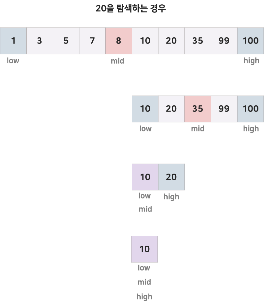 - 찾고자 하는 값이 속해있지 않은 부분은 전혀 고려할 필요가 없기 때문에, 매 단계에서 검색해야 할 리스트의 크기를 반으로 줄일 수 있습니다.